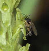 Hammarbya paludosa est pollinisé par de minuscules diptères du groupe des Nématocères. Nous avons pu en observer quelques espèces différentes qui fréquentaient les fleurs de Malaxis, 4 de la famille des Mycetophilidae (Neuratelia sp, dont Phronia digitata) et une de celle des Sciaridae. Actifs par temps couvert ou crachin, ils évitent les heures les plus chaudes de la journée s’il y a du soleil, et cessent toute activité par grand vent ou forte pluie. L’insecte se pose sur les sépales, qui servent de piste d’atterrissage, en particulier le sépale « dorsal » situé en position inférieure, et lèche avidement le labelle qui sécrète très probablement du nectar, ou une substance analogue, le long de ses stries verdâtres. L’insecte introduit sa tête au fond du labelle ; le viscidium touche alors le dessous du cou, et les pollinies y adhèrent ; le rostellum les empêche d’entrer en contact avec le stigmate. Puis le diptère s’envole, avec son précieux fardeau collé sous sa tête.