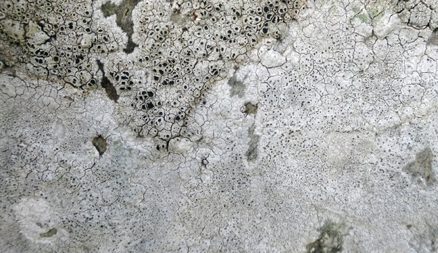 crustacé aréolé-fendillé, gris plombé un peu bleuté, souvent bordé d'un hypothalle