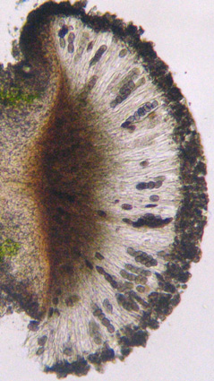 plates au début puis plus ou moins convexes, 0,3-1 mm de diamètre. Spores brunes,