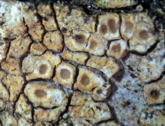 | Thalle crustacé, mince, jaune ocracé à jaune rougeâtre, fendillé-aréolé. Apothécies lécanorines nombreuses, concaves, enfoncées dans le thalle, disque brun orangé, bord thallin visible, 0,15-0,4 mm de diamètre. Spores ellipsoïdales, par 8, incolores, 12-24 x 6-12 µm. K- ; C- ; KC- . Se rencontre en régions humides, sur roches acides. Espèce aquatique, au bord ou dans ruisseaux et lacs, ou sur des rochers temporairement recouverts d'eau. |