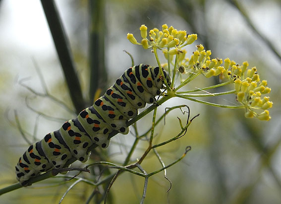 Chenille sur fenouil, puis chrysalide. Kergreis, Plougonven (29), août 2005.